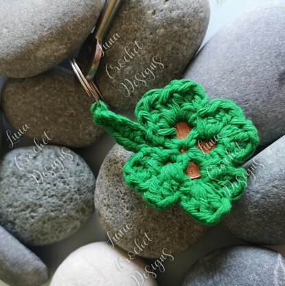 You will need: 3 mm crochet hook, yarn needle, lucky coin, key ring (optional), scissors, DK (size 3) yarn. I used 100% cotton So Crafty Amigurumi yarn: approximately 6 m of colour green. My gauge/tension is 3 rows/ 3 stitches = 1 x 1 cm, make sure your coin fits Finished clover is about 5 cm across. It fits UK penny, US cent and various other coins which are about 19 – 20 mm in diameter.