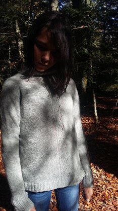 knitted sweater, top down, seamlessly with raglan sleeves. You will start by knitting the collar, and then you will increase the back, sleeves and front while also knitting a little lace panel. After separating the body and sleeves, you work in stockinette st back and front in stockinette st and lace. You will end the body through a rib band. The sleeves are knitted in the round in stockinette st and end with ribs.