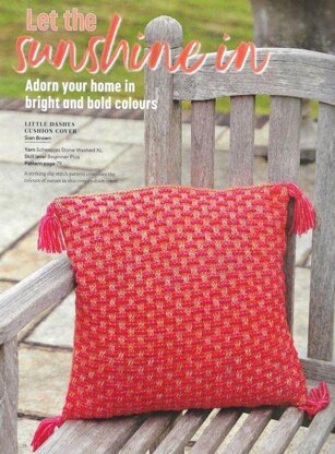 This is a pattern for Little Dashes cushion cover, originally published in Knitting magazine. It has a stocking stitch back, a simple mosaic slip stitch front, moss stitch edges and tassels at the corners. Photos Knitting magazine.
