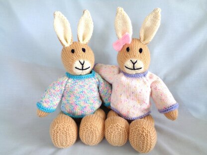 The bunny is knitted in stocking stitch along with his/her Jumper which is removeable