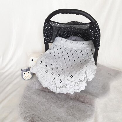 This blanket is knitted with DK acrylic yarn with 4mm needles, and measures approx 55x65cm, which is just right for baby's first blanket. You don't want anything big folded twice or even four times risking to overheat the baby.