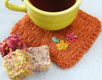 Stitches are cast on and the coaster is worked before blocking and embroidery.