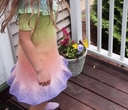 Ruffles, bobbles, lace - this dress has it all! A companion pattern to my adult Fiesta Top, Little Fiesta is just as charming and fun to knit. Simple top-down construction allows you to customize this pattern to be a top, tunic, or a dress. Options for omitting lace and bobbles, or adding long sleeves is also included. Perfect for long-gradient yarns, or any Fingering weight yarns, this dress can be made for any season.