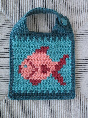The Little Fish Bib is crocheted using the star stitch. The star stitch allows you to carry and conceal colors creating a reversible fabric. Single crochet and single crochet ribbing (for elasticity) are used to form the strap with buttonhole and tab with button. Eliminating the strap and button tab, would give you a very nice child’s washcloth to match.