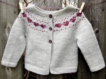 Little Hearts is a simple baby cardigan that features a sweet colorwork heart yoke detail.