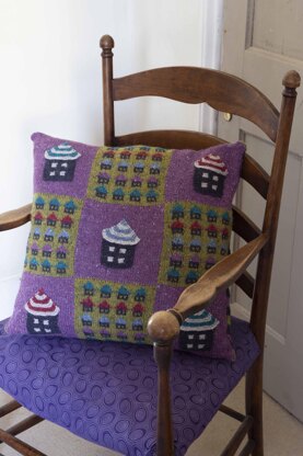This knitted patchwork cushion is made from 9 knitted squares, five plain and four with Fairisle little houses motifs. To the plain squares little garter-stitch houses with striped roofs are applliqued. All knitted in Rowan Felted Tweed DK. The pattern includes an altlernative colourway.