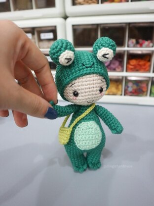 Yarn: Depends on your choice. I use Lamia Cottony with colors: cream, dark green, green, white and mint green. Hook: Size 3mm for hat and size 2,5mm for other parts. He’s tall 15cm from eyes on hat to toe if you use the same materials as me