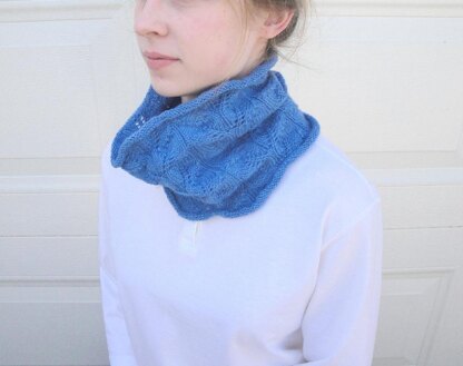 A pretty blue cowl with a lace pattern that suggests sweet little leaves...