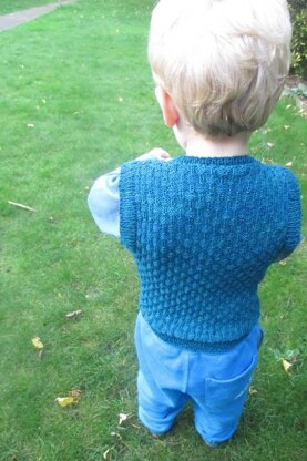 Little Lines is a vest for children up to 7 years. The vest is worked in the round from the lower hem up to the armholes before dividing, and front and back are worked flat. The name comes from the stitch pattern, which is worked all over the garment and consists of little lines of knit stitches worked on a reverse stocking stitch background. To achieve this without having to work so many purl stitches, the vest is worked inside out, the shoulders are seamed with a three-needle cast-off and then the garment is flipped inside out to reveal the true stitch pattern. Stitches are then picked up around the armholes to work borders, and around the neck to work the neckband.