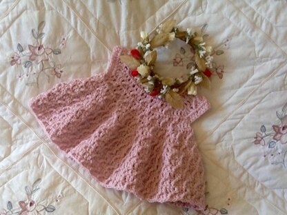 Pretty little dress with that lace look. Textured with raised stitches throughout. Crocheted entirely in one piece with no seams. Simple crochet stitches used. For ages 2-4 years old.