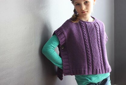 Little Miss Margo is the child/tween version of my [Margo Poncho][1] pattern . It is worked flat, in two pieces (front and back), and attached at the shoulders using the three needle bind-off technique. Front and back sides are buttoned together. Both the front and back feature an easy faux cable stitch pattern and the back piece is longer than the front, creating a more modern silhouette.