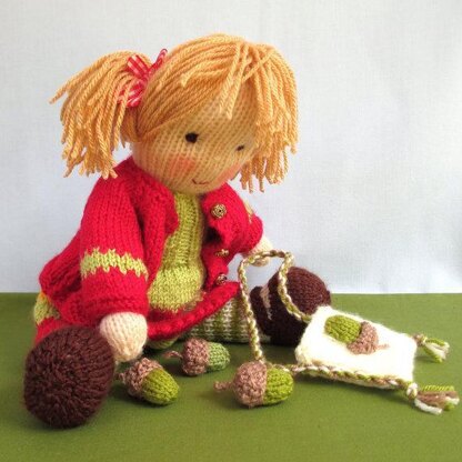 PATTERN INCLUDES: Doll, dress, cardigan and panties (clothes removable), bag and acorns.