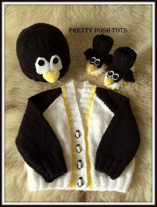 Materials100g black dk yarn100g white dk yarn75g yellow dk yarn4 buttons for the cardigan6 x 10mm black button for eyes on hat and shoessmall pieces of white felt(placed behind the eyes on the shoes)3.25mm needles4mm needles