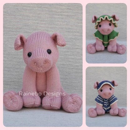 This sweet little piggy is knit in-the-round, using Magic Loop or double pointed needles. The four legs and body are all knit on as you go. Freely sitting approx. 10” tall, Little Piggy is worked in worsted wt. (Aran/10-ply) yarn, using approx. 260 yds., and piggy’s clothing, using approx. 120 yds. (each set). All clothing is removable, so there’s lots of fun in store for dress-up playtime with this darling little piggy.