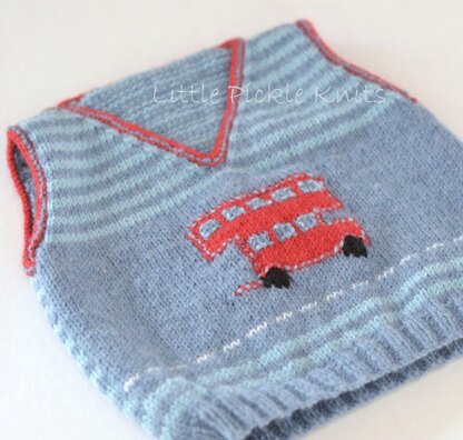 The red bus is worked as an intarsia motif and the back has a simple stripe repeat.