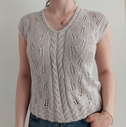 Knitted in a lovely lace pattern, this romantic tee with deep V-neck has a cabled border at the neck, hem and the armholes.