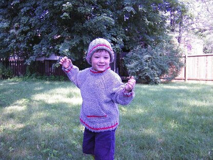 A little boy's raglan pullover made with a hard-wearing but soft-to-the-touch acrylic/cotton yarn in a rugged grey and white mix with bright red accent stripes at the cuffs, hem, collar and front pocket.