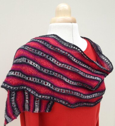The colours of these lovely lace weight yarns remind me of a beautiful sunset at the end of a summer’s day. The scarf is knitted lengthwise, using short row shaping to make the little sunsets in pink and red. You work each little sunset separately before knitting along to the position for the next one. The borders and stripes have a row of grey eyelets between black garter stitch ridges. The edges of the scarf have a small garter stitch border. The Little Sunsets scarf measures 130cm x 27cm (51in x 10.5in). For the colour combination shown in the pattern picture, I have used the following yarns and shades: Rowan Fine Lace (934) Noir and (935) Vamp, Manos Del Uruguay (7311) Iris and Debbie Bliss Rialto Lace (009) Cyclamen. To knit this short scarf, you need 20-25g of each of these 4 shades. Little Sunsets is part of a collection of scarf designs that use short row shaping to create 'pops' of colour. (Little Suns, published in the Knitter Magazine, Issue 47, uses a similar techniq