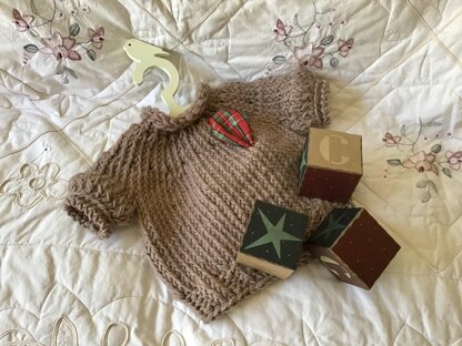 Special design in the Little Town Pullover Rosie. Knit entirely in one piece with no seams. Unique slip stitch crocheted sleeve edge. Simple knitting stitches throughout. For ages 1-3 years old.