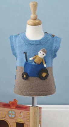 Delight a tractor-mad toddler or baby with this cheerful tank top. A cosy knit that comes to life with its applique pocket and fun colours! For extra cuteness there is a knitted toy farmer to go with this garment. The little farmer loves to sit in his tractor, but is equally happy to join in with playtime, too.