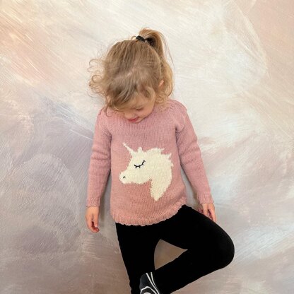 The little unicorn sweater is knit in stockinette in 4 pieces, front, back and two sleeves from the bottom up. It is complete with ribbed edges.