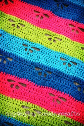 Call it a butterfly, call it a dragonfly…whichever you choose, it’s Little Wings! This blanket works up quite fast once you get the hang of making the wings design. Made up of bright stripes of color, the Little Wings are woven right into the rows.
