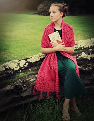 About the Pattern: This beautiful “readers wrap” or wide scarf features ribbed knit-look pockets where you can tuck a favorite book away for safe-keeping. The edges are decorated with several tassels.