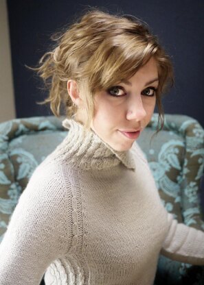 A reversible crossed rib collar flows into the raglan shaping and then down to the side panels of this pullover. Minimal ease, ribbed side panels and a bit of waist shaping give this sweater a close, but not overly tight fit. The turtleneck can be worn buttoned up against a cold wind or left open to show off the reversible stitch pattern. Shown modeled in size 34 on a 33.5 inch bust.