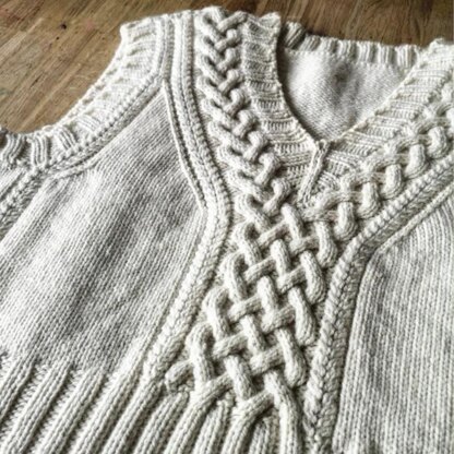Llif is an Aran weight sleeveless sweater vest, with cables that appear to flow up the front of the vest, split to follow the V-neck line and then flow down the back. Llif is knit in the round from the hem up to the underarms where it splits and is worked back and forth up to the shoulders. The shoulder seams are finished with a three needle bind off. The neckline and armhole edging are then picked up and worked in the round. This pattern is designed to be a waist length cropped design, but it may be worked longer or shorter as desired so long as the correct chart repeat is worked to, the pattern indicates where this applies.