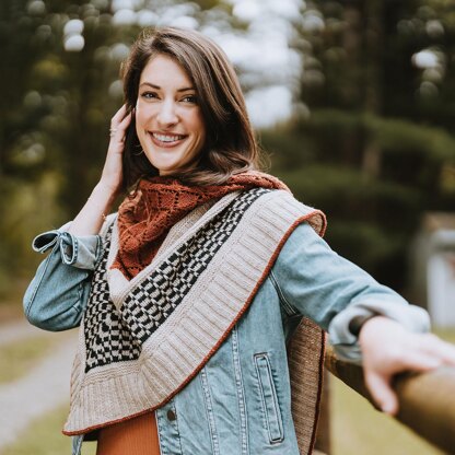 A grand wrap for fall (and every season to come) — Lochlann by our pal Cheryl Toy is one big, squishy, cozy shawl covered in leaf lace, slip stitch stripes, garter stitch, ribbing, and bound off with a contrasting I-cord for a spectacular finish.