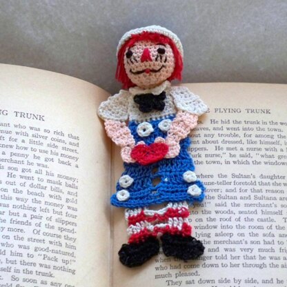 I made this reading character bookmark pattern for Raggedy Andy lovers everywhere. He is holding a heart that Ann gave him. This is a fun bookmark to make The crochet stitches include, sc, hdc, dc, tr, sl st and working in front and back loops. The pattern includes description of abbreviations and complete instructions. It uses small amounts of crochet thread and any colors can be used so it is a great project to use up small amounts of crochet thread (15 yards being the most that is needed). Other materials Needed:Small amount red (or choice of mouth and nose color) could also use embroidery floss 1 skeins red (or choice of hair color) embroidery floss Small amount of polyester fiberfill Tapestry needle Boye Steel Crochet hook size 1 (2.25mm). This is a larger size hook than usually used with thread crochet to get the correct size. You will also need a Steel Crochet hook size 10 (1.0mm) for buttons ***Uses US crochet terms