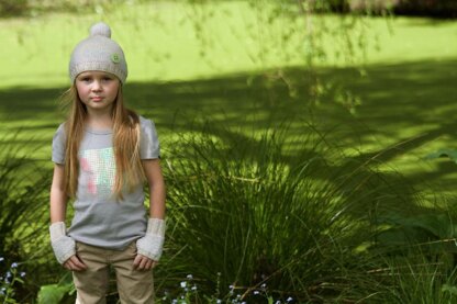 The hat pattern has two versions, knitted flat on straight needles or on the round on double pointed needles. The mitts are worked flat.