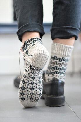 Yarn used in sample (size 2) is The Fibre Company Amble (70% wool, 20% alpaca, 10% nylon): 1 skein (325 m 355 yds / 100 g) in Chalk Cliffs as main colour, one mini skein (81 m 81 yds / 25 g) in Fair Hill as contrast colour 1 and one mini skein (81 m 81 yds / 25 g) in Blackbeck as contrast colour 2. Note: this is a slightly thicker yarn than typical sock yarn.