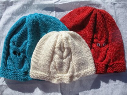 This beanie is worked from the brim to crown in the round. The brim is simple garter stitch, and the body features a panel consisting of a single owl cable on a reverse stocking stitch background.