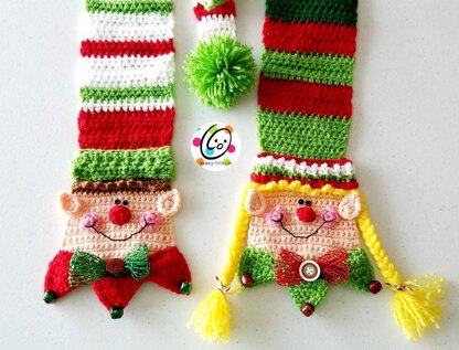 Description: Instructions included for making a long tail scarf, with or without a keyhole (slot to slip scarf through). Boy and girl elf versions included.