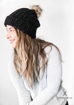 Worsted weight [4] yarn : 1 skein (~142g) (I used Heartland « Black Canyon » from Lion Brand yarn) -Tapestry needles for sewing and weaving in ends -Scissors -Faux fur pompom (optional)