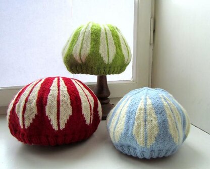 Inspired by the simplicity and beauty of the retro kitchen enamel ware from Kathrineholm, I knitted this hat! The shape of the hat and the clean lines of the lotus leaf make this a fun and beautiful hat to wear. Sizes are given for adult and children, in parentheses. Knit it in the traditional colours or experiment with your own favorite colour combinations!
