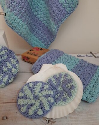 How often does one get the chance to invent a crochet stitch? For me, probably once in a lifetime: the Lotus Bud Stitch (Lbs), so named because its texture is reminiscent of a lotus bud. The variety of patterns in this spa set give you different ideas on how to work with this stitch, either in the round or in rows. The set consists of a face towel, a bath mitt, make-up remover pads and a tawashi scrubby sponge (or kitchen scrubbies).