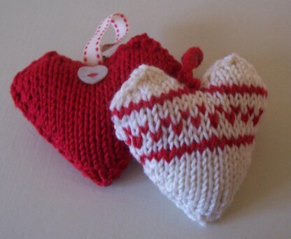 A pattern that has instructions for making both a plain or simple Fairisle heart in one of 3 sizes. Knit flat on 2 needles and seamed before stuffing with either a ribbon or cord loop. A quick and easy make for a gift.