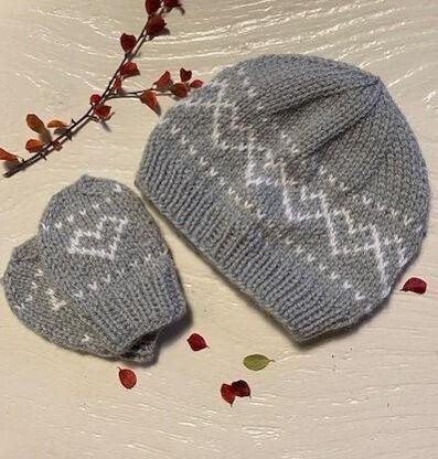 A cosy hat and mitten set for newborn babies knitted in the round on double pointed needles. Using the Fair Isle technique for colourwork, you create this beautiful heart design which thickens the finished fabric for extra warmth and cosiness keeping your bundle lovely and warm. This would make a fantastic and thoughtful gift for a baby shower or for any expecting parents. As handmade, it will be treasured, handed down and kept for years to come. The hat and mittens knit up quite quickly, usually within a few hours so the perfect gift or project for busy knitters!