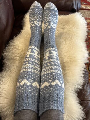 A few years ago I wanted to make socks as a wedding gift for a young couple. I used 7 brothers yarn (by Novita), which I think is the best Aran weight sock yarn out there. The socks are almost knee high and fit women size 6 and up foot. The leg and ankle are not for wide legs, though. The cuff and ankle have a cable pattern. I am also selling a similar pattern for men's socks.