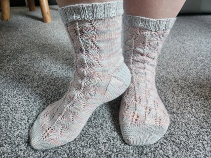 Pretty cuff down, knit in the round, lace pattern socks in 3 sizes S,M & L.