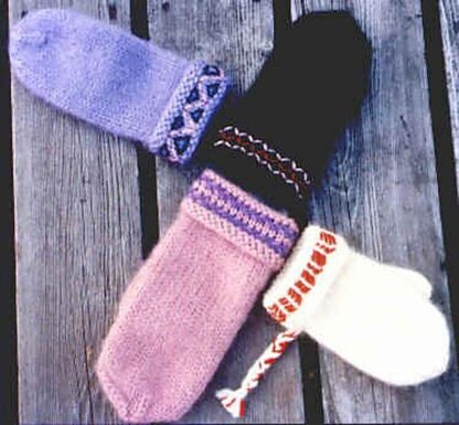 These Lovikka mittens are cushiony, being made of two strands of yarn and then fulled (felted)! The knitting is very simple and includes turned up cuffs. There are directions for two ways to full the mittens. After fulling to the desired size, the mitten is brushed, inside and out, for warmth and coziness, with optional embroidery and braid on the cuff for a traditional look. Glossary, bibliography, schematic, and chart for embroidery are included.