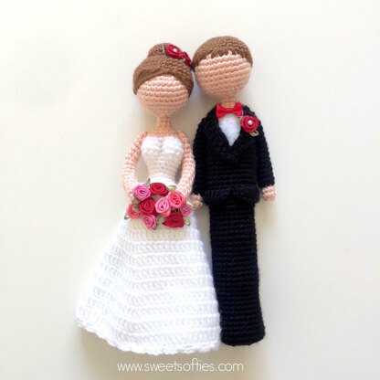 The Loving Bride & Groom Pattern provides instructions for crocheting this beautiful, newly wedded couple. The elegant bride is fitted in a feminine A-line wedding dress, while her handsome husband is dressed in a classic tuxedo. The dashing pair makes wonderful engagement and wedding gifts for brides-to-be, grooms-to-be, newlyweds, or married folks celebrating their wedding anniversary. They can even be used as a wedding cake topper if secured on a base! Crafters can customize and personalize these dolls in a variety of ways by changing hair color, dress color, hairstyle, and dress style. You may also add embellishments, such as beads, buttons, flowers, bows, and other appliques to these dolls! This 18-page pattern includes complete written instructions with accompanying photo references for crocheting both dolls from start to finish.