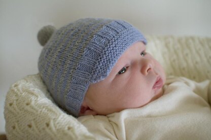 A fun stripy hat with a peak and a knitted pompom. The pattern has two versions, knitted flat on straight needles or on the round on double pointed needles.