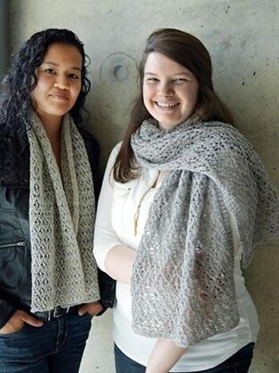 This semi-sheer scarf sparkles with light due to a large proportion of negative-to-positive space. A concentration of decreases in some rows pulls the corresponding eyelets wide open, allowing the illumination of spidery star shapes with diamond outlines. The pattern is further enhanced by using a yarn which has some sheen or luster fiber content; this project is a good candidate for the addition of beads. Substituting yarn and/or needles may result in an overall variation in size and drape.