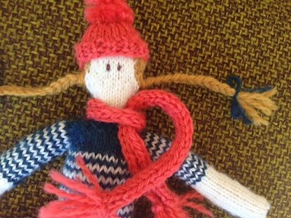 Kitted in fingering yarn, Lucinda is the perfect stash busting project with lots of opportunity for customization. Work the legs in crazy colors to give her tights, make a rainbow shirt or short sleeves or long, use up special bits of yarn for her scarf and hat! Lucinda will love it all, fashionista that she is!