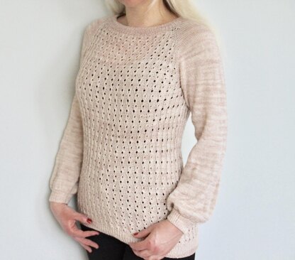 Pretty lace is always a winner when it comes to sweaters. Lucindas mom is a lightweight, raglan sweater knitted top down in one piece.