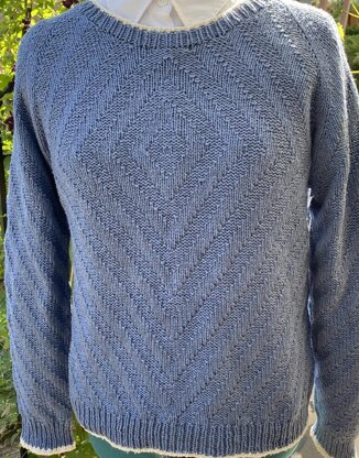 Knit from the top down with raglan sleeves and no seams, this pullover features diagonal ribbing. The ribbing is k4p4 which moves diagonally every other round, both right-leaning and left leaning. At the separation of body and sleeves the direction changes and makes a diamond center on the front and the back. If desired, use contrast yarn to edge the ribbing for 1 row plus the BO row. The pattern is knit flat, until enough sts are increased to join the pullover in the round.