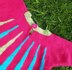 I specialize in one piece knitting with minimal seaming. This dress is designed to be knit flat, in one piece, from cuff to cuff. The borders are garter stitch. The dress is narrower, short sleeved and with a brand new neckline, with mitered corners. The neckband is knit flat, but using circular needles, because it curves round the opening. The triangles can be knit in several bright contrasting colours or just one.